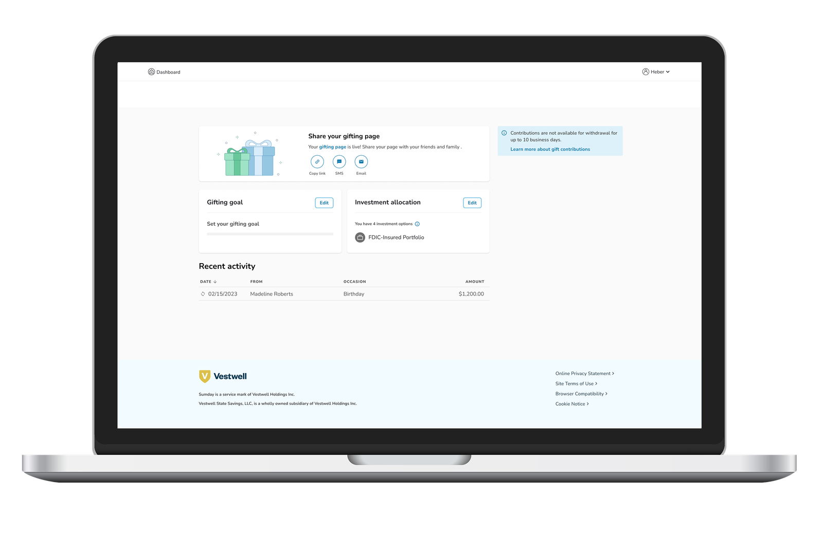 Once a gift contribution has been processed, you’ll get an email letting you know someone contributed to your account. All processed gift contributions will also appear in your activity feed. Please keep in mind that any gift contributions made through an online gifting page will not be available for withdrawal for 10 business days.